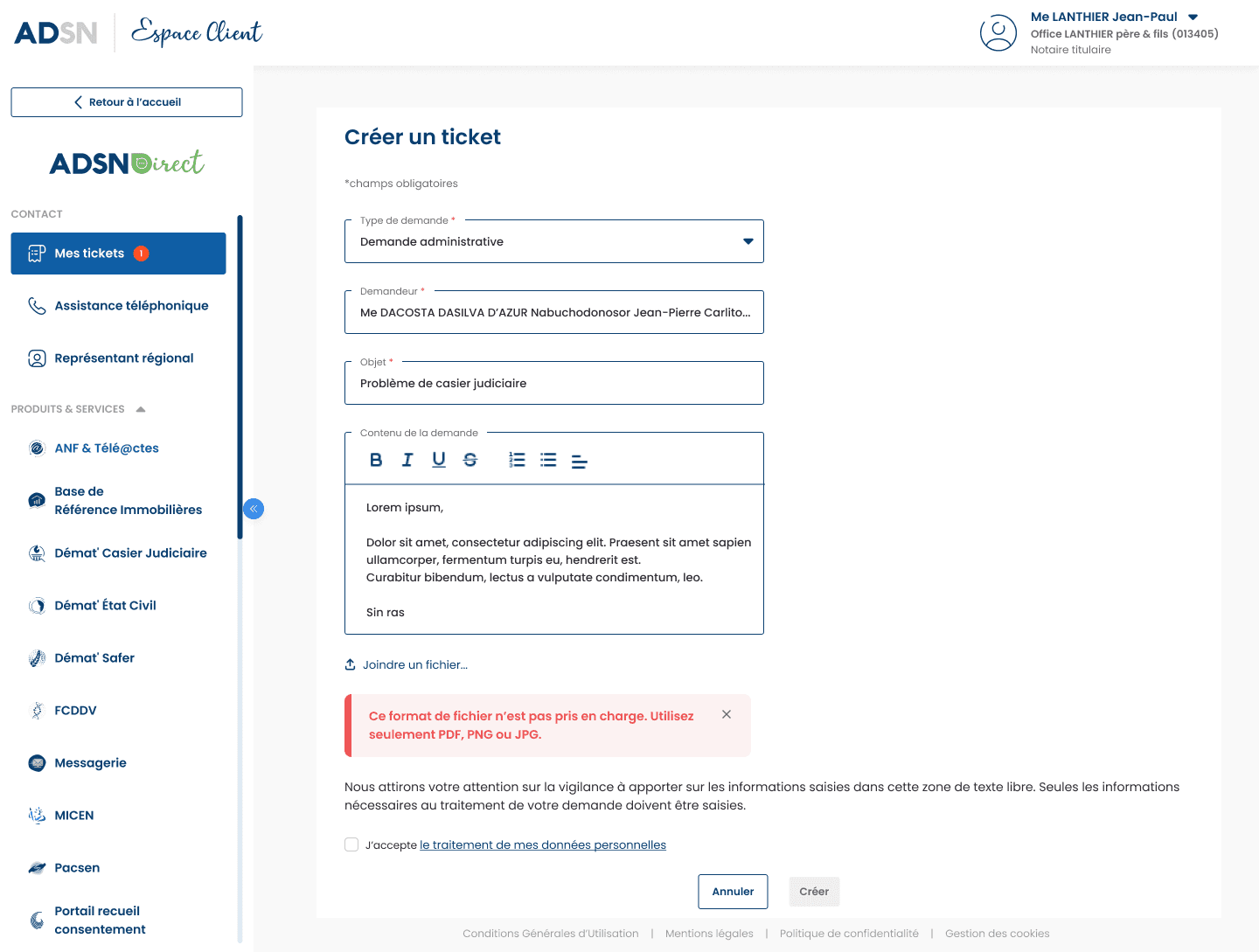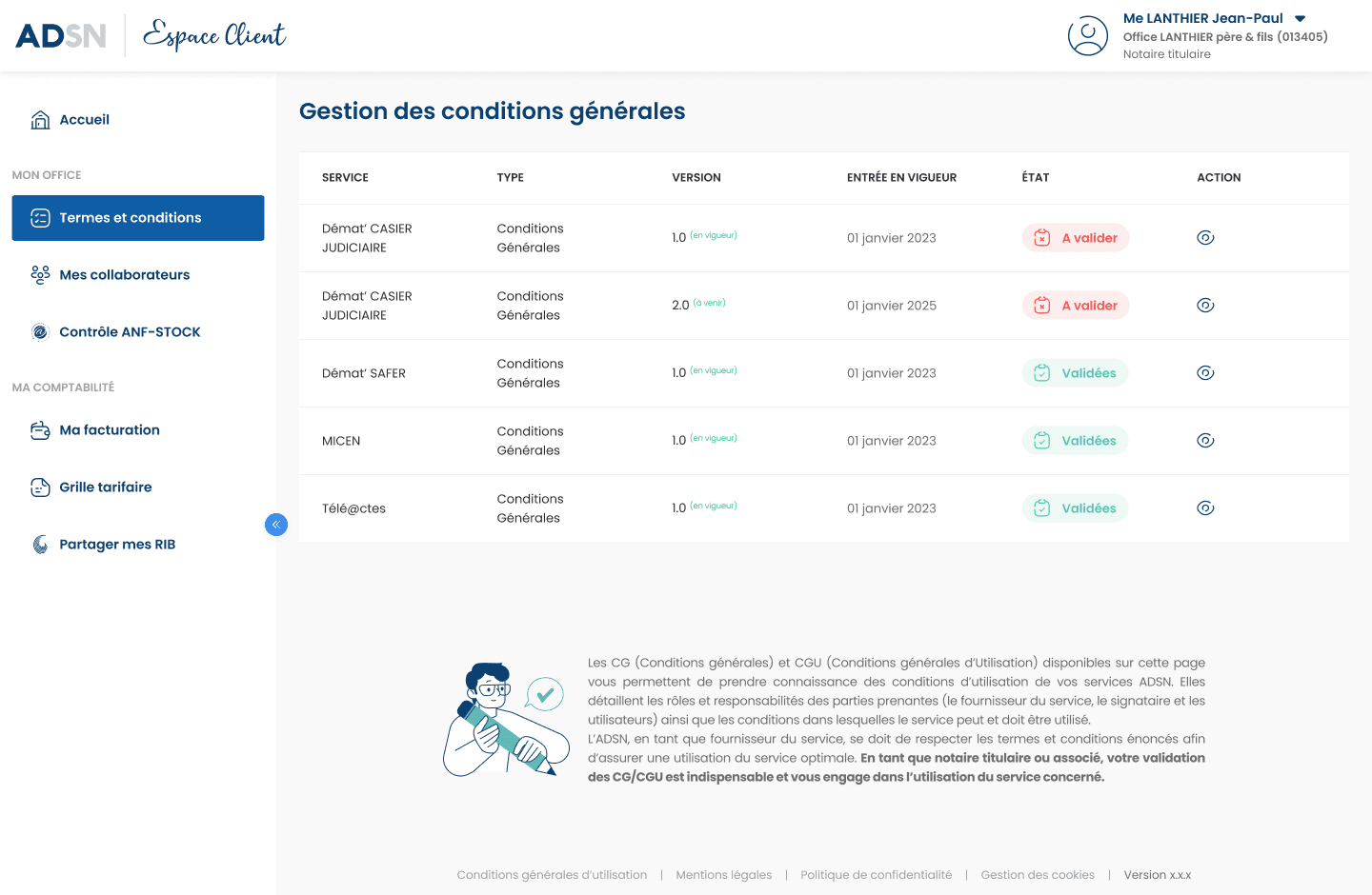 ADSN est un partenaire majeur du Conseil Supérieur du Notariat. L’entreprise est tenue de répondre aux exigeantes des décrets établis par l’état Français sur la validité des logiciels régaliens utilisés par toutes les offices notariales.